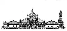 The basic functional design of the station with the combination of a large terminal hall at a low level and two flanking through halls at a high level is considered to be the work of Claus Koepcke, a ministry of finance official, and Otto Klette.[6] This functional framework was based on an architectural competition held in 1892 for the design of the new station. Dresden architects Ernst Giese and Paul Weidner and Leipzig architect Arwed Roßbach each won a first prize.[7] The realised design incorporates elements of both drafts. Construction began in the same year, led by Ernst Giese and Paul Weidner. Railway operations continued at the Bohemian station while the south hall was opened to traffic on 18 June 1895. Subsequently, the Bohemian station was demolished and the construction of the central and northern halls started on its site. Until the completion of the entire building, the south hall served as the provisional station.[3]