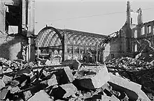 The conversion of the station into Dresden Hauptbahnhof was subsequently considered several times. In the late 1930s the Nazis planned the reconstruction of Dresden, which would have included a new central station in place of Wettiner Straße station. The proposed station would have had enormous dimensions, the new station would have been 300 metres long and 200 metres wide with an oversized courtyard and spacious streets intended for rallies and marches. Nearby between Freiberger Straße and Ehrlichstraße there would have been another area for rallies called the Reichsbahnbogen (Reichsbahn bow). With the outbreak of the Second World War, however, these plans quickly became obsolete.[6] During the Bombing of Dresden in 1945 the structure of the train shed was greatly affected. However, the damage was not so severe that it would have justified the demolition of the train shed, including three corner pylons, that was completed in 1953. Just one of four pylons was preserved, because it contained the flue for the station's heating system.[7]