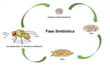 Additionally, an unknown factor contributes to increased fitness benefits of Wolbachia infection.[5] The presence of a Wolbachia infection can increase the fitness of a female fly by increasing her size and enhancing her fertility.[5] Moreover, the D. innubila DNA nudivirus "DiNV" is a common viral infection amongst this species.[7] It has been shown that certain Wolbachia can protect their hosts against viral infection, even leading to biocontrol strategies that use Wolbachia infection to suppress the spread of viral diseases.[8] What role (if any) Wolbachia plays in defense against viruses is unclear. However, other studies that investigated the contribution of Wolbachia infection to the fitness of Drosophila species suggested that the bacteria can enhance survival of its host in the presence of oxidative stressors as well as prevent other pathogens from infecting the host by outcompeting them for host-derived resources like cholesterol.[9][10] In addition, it is also suspected that Wolbachia may also be able to manipulate the expression of its host's DNA through utilization of host microRNA.[11]