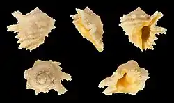 The shell size varies between 20 millimetres (0.79 in) and 45 millimetres (1.8 in).[3][4] The shells of this species are yellow-mouthed and develop marginal lobate digitate processes. On the outer lip the teeth are singularly arranged. The radula has small and slender lateral teeth and a greatly modified rachidian radular tooth.[5]