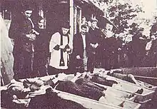 Mourning ceremonies in the village of Bajorai over the bodies of the Vinslovas family, which was executed on June 23, 1944 in the village of Vymančiai during a retaliatory action by the 5th Brigade of the AK.[11]