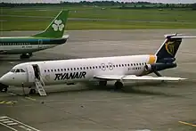 Two of the airport's largest operators side-by-side, a Ryanair BAC 1-11 (front) in its oldest livery, and an Aer Lingus Boeing 737 (rear) in 1993