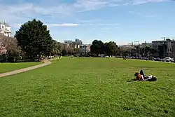 The space was designated by the city as public park land in 1858, but it was not until 1902 that the park was built. This coincided with a period of rapid development of homes in the surrounding area, now known as the Duboce Park Landmark District. The 1906 earthquake and fire devastated much of San Francisco; however, the Duboce Park area was relatively undamaged and the park was used as a refuge camp for a year for displaced citizens.[6]