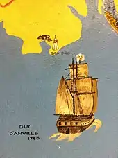 The expedition included 11,000 men and a fleet of 64 ships.[3] The expedition was led by French Admiral Jean-Baptiste Louis Frédéric de La Rochefoucauld de Roye, Duc d'Anville. The commissary general in charge of supplies was François Bigot. The fitting-out of this fleet was slow and difficult, and it did not set sail from Île-d'Aix, France until 22 June 1746. A subsequent storm in the Bay of Biscay and adverse winds slowed the transatlantic crossing. Disease broke out on the ships – typhus and scurvy.