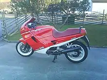 The finished design was christened the Paso 750 and debuted at the 1985 Milan Motorcycle Show, along with a 350cc version that was never produced.[8] Although initially offered only in red, by 1988 it was offered in red, blue and pearl white.[2] Ducati and Cagiva had hopes that the new machine would redefine sports touring motorcycling and complement their sports bike line, especially in the American market.