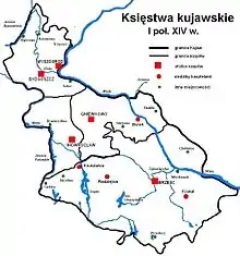 ![]() Location of the Duchy of Bydgoszcz and Wyszogród within the borders of the Kingdom of Poland in years 1304–1333. | |||||||||