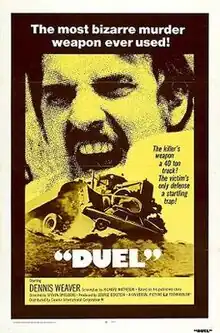 Duel is a 1971 American action-thriller[1][2] television film directed by Steven Spielberg. It centers on a traveling salesman (Dennis Weaver) driving his car through rural California to meet a client. However, he finds himself chased and terrorized by the mostly unseen driver of a semi-truck. The screenplay by Richard Matheson adapts his own short story of the same name, published in the April 1971 issue of Playboy,[3] and based on an encounter on November 22, 1963, when a trucker dangerously cut him off on a California freeway.[4][5]