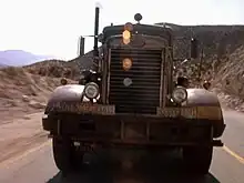 The truck was manufactured as a single axle, with a Rockwell TK-570 tag-along axle behind it. It had a 245 hp (183 kW) CAT 1673B turbocharged engine with an RTO-913 13-speed transmission, making it capable of hauling loads over 30 tons (27 t) and reaching top speeds of 61–65 mph (98–100 km/h) although the truck was made to appear that it was going faster than it actually was on the big screen. A single truck was used for the original filming, so the shots of it falling off the cliff and being destroyed had to be completed in one take.[15] Although another back up truck that was a 1960 Peterbilt 281 was built up for the original filming when the Cat Engine in the original 1957 Peterbilt 281 had begun giving the film production problems during rehearsals not knowing if the original 1957 Peterbilt 281 would make it to the last day of filming. On the last day of filming the back up truck was taken off of the film production, leaving them with only one truck at the time to film the final scene of the film. This 1960 Peterbilt 281 back up truck is the only truck known to survive today. The 1960 Peterbilt 281 had originally featured a 262 Cummins Engine with a 5 X 3 Transmission at the time filming had taken place, but has since been repowered with a small cam NTC-350 Cummins Engine with a 5 X 3 Transmission and has since had a live tandem put underneath the truck. Another truck was purchased to shoot the additional scenes for theatrical release in April of 1972; this truck was a 1962 Peterbilt 351 with also a 245 hp (183 kW) CAT 1673B turbocharged engine that was capable of reaching top speeds of 61–65 mph (98–100 km/h) and a 5 X 4 Transmission that is verified to be long gone today. KW Mudflaps were also visible on this truck at the time of filming.