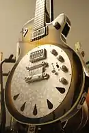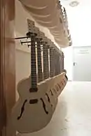 Most of the instruments are semi-hollow constructions.[3] However, the solid body guitars also feature many traditional elements.[4] Duesenberg combines these traditional shapes with design elements of the Art Déco style, which is expressed in overall designs, as well through the use of rare and eccentric materials. Typical for this style are parallel lines, stepped geometries and extended curves.
