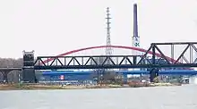 The Duisburg–Hochfeld railway bridge (German: Duisburg-Hochfelder Eisenbahnbrücke) spans the Rhine in the German city of Duisburg on the Duisburg-Ruhrort–Mönchengladbach line. The first bridge was built by the Rhenish Railway Company and put into operation at the end of 1873. It was replaced by a new bridge in 1927, which was badly damaged during the Second World War, but rebuilt and is still serves rail traffic between the Ruhr region and Aachen.