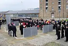 Dundee International Submarine Memorial was dedicated on 17 September 2009.[4] It commemorates the crews who are "Still on Patrol" and honours the gallantry of all the submariners who went on patrol from the River Tay during the Second World War. The memorial is sited between Victoria and Camperdown docks in Dundee Harbour, an appropriate location as the two docks were much used by the wartime submarines.[5]