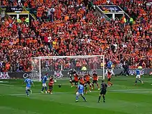 Eleven years passed until the next Scottish Cup final appearance, when United lost 1–0 to Celtic in 2005. Sandwiched in the middle of these appearances was a defeat on penalties to Stenhousemuir in the Scottish Challenge Cup (when United failed to concede a goal in the whole competition) and a 3–0 defeat to Celtic in the 1997 Scottish League Cup Final. United then lost the 2008 Scottish League Cup Final on penalties to Rangers after the match had finished 2–2 after extra time. Dundee United won their next major trophy in 2010, under the guidance of manager Peter Houston, when First Division side Ross County were defeated 3–0 in the 2010 Scottish Cup Final.[50] David Goodwillie scored the first goal and Craig Conway scored the second and third goals in front of 28,000 Dundee United fans at Hampden Park.[50]