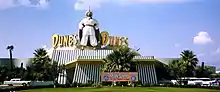 Lee Klay of the Federal Sign and Signal Company designed a roadside sign for the Dunes,[236][241] activated on November 12, 1964.[242] Klay recalled that the resort owners asked him to create "a big phallic symbol going up in the sky as far as you can make it".[241] At 181 feet,[236] it was the tallest free-standing sign in the world.[70] The foundation measured 80 feet in width,[70][238] and supported two white-colored columns forming a bulbous onion dome or stylized spade shape at the top. Contained within this shape were two-story-high letters spelling out "Dunes", with a large diamond atop the lettering.[236][241]