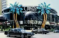 The Oasis Casino featured curved neon palm trees at its entrance, standing 70 feet with fronds 20 feet in length. They were designed by Ad-Art sign designer Jack DuBois, based on early design work by Raul Rodriguez.[209][210] The palms were dismantled in April 1993, after being sold during the liquidation sale to a buyer in Taiwan.[211] By 1999, the palms had been installed at the entrance to the NASA nightclub in Bangkok. The club closed some time after that, and the whereabouts of the palms are unknown.[209][210]