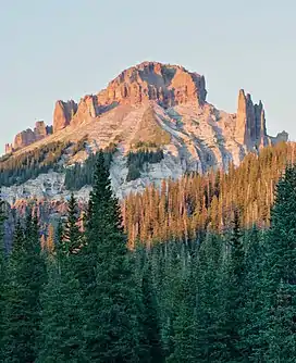 Dunsinane Mountain, or officially Dunsinane, is a 12,742-foot-elevation (3,884-meter) mountain summit located in Hinsdale County, of Colorado, United States.[3] It is situated 11 miles east of the community of Ridgway, in the Uncompahgre Wilderness, on land managed by Uncompahgre National Forest. It is part of the San Juan Mountains which are a subset of the Rocky Mountains, and is situated west of the Continental Divide. Topographic relief is significant as the east aspect rises 2,500 feet (760 meters) above the Middle Fork Cimarron River valley in approximately one mile. The mountain's name was officially adopted as Dunsinane by the United States Board on Geographic Names in 1966, and is so named because it resembles the castle Dunsinane of Shakespeare's Macbeth.[3][5]