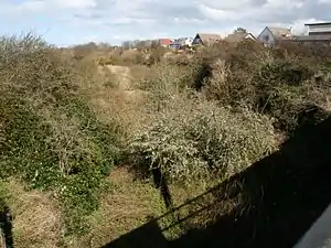 The station consisted of an island platform, accessed from the road bridge at the end of the platform.[2] The overgrown island platform still exists today.