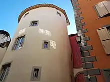 The Thiers ramparts are fortifications built between the 11th and 16th centuries to protect the town of Thiers.[34] From the 11th century onwards, the town grew in concentric circles around the ramparts of the castle of the Lord of Thiers and the church of Saint-Genès. As new towns were added around the city walls, the walled city expanded at least five times.[35] The less well-maintained parts of the various walls were demolished at the end of the eighteenth century, but it was above all the urban development of the nineteenth century that led to the demolition of several segments of the northern wall and the reallocation of the eastern wall. In the 19th century, only the eastern part of the fortifications remained intact.[35] In particular, it served as a retaining wall to hold back soil from the city's slopes.[35][36]