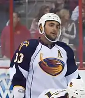 On June 24, 2010, Byfuglien was traded by Chicago, along with Brent Sopel, Ben Eager and Akim Aliu, to the Atlanta Thrashers for the New Jersey Devils' first (Kevin Hayes) and second round pick in the 2010 NHL Entry Draft, Marty Reasoner, Joey Crabb and Jeremy Morin.[9] The Thrashers moved Byfuglien back to his natural position of defense, although he had experience as a first-line and second-line winger with the Blackhawks, including the Blackhawks' run to the Stanley Cup in 2010. He became an alternate captain for the Thrashers after a few months into the 2010 season. Byfuglien was selected to his first All-Star Game, along with teammate Tobias Enström.[10] In the 2011 All-Star Game's Skill Competition, his slap shot was clocked at 102.5 mph.[11] A month later, on February 15, 2011, the Thrashers signed Byfuglien to a five-year, $26 million contract extension.[12] He scored 12 goals along with 41 assists during the 2011–12 season that saw the Thrashers move to Winnipeg. Byfuglien appeared in 66 games for the Jets that season and was again invited to the NHL All-Star Game.[13]