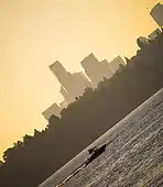 In filmmaking and photography, the Dutch angle, also known as Dutch tilt, canted angle, or oblique angle, is a type of camera shot which involves setting the camera at an angle so that the shot is composed with vertical lines at an angle to the side of the frame, or so that the horizon line of the shot is not parallel with the bottom of the frame.[1] This produces a viewpoint akin to tilting one's head to the side.[1] In cinematography, the Dutch angle is one of many cinematic techniques often used to portray psychological uneasiness or tension in the subject being filmed.[2] The Dutch angle is strongly associated with German expressionist cinema, which employed it extensively.[1][3]