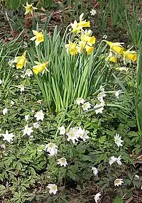 Wild daffodil (Narcissus pseudonarcissus) is a particular feature of the woods in early spring. Other locally uncommon species include bitter-vetch, tutsan and lily-of-the-valley.[5]