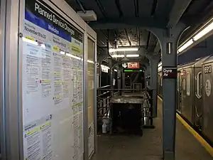 The Dyre Avenue station was rebuilt as part of the plan in 1963–1964. A 525 foot (160 m)-long concrete island platform was built atop the line's former northbound express track, and the wooden northbound platform was removed following the project's completion. Two new staircases were installed to the platform. A canopy was installed, covering the center of the platform, in addition to fluorescent lighting. The preexisting entrance to the station was sealed off, replaced by a new entrance on the station's west side. A new change booth and restrooms were installed.[8] Previously, trains had used the northbound side platform as the terminal with the southbound platform unused. Remnants of the side platforms still exist.[9][10][11]