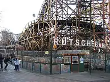 Bakken may have started as a place to get clean spring water, but today it is a thriving amusement park filled with modern rides and amenities. Bakken is home to five roller coasters, the most famous of which is Rutschebanen (lit. 'Roller coaster'), a wooden roller coaster open since 1932. It was deemed a Coaster Classic by the American Coaster Enthusiasts (ACE)[4] until the end of the 2009 season, after which the trains were updated and the brakemen who rode along to control the speed were retired, leading ACE to rescind its Classic status.[5] The park is also home to dozens of other amusements and smaller rides suited for all ages.