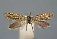 The wingspan of the moth ranges from 9–14 mm. The wings are metallic gold with sapphire-blue and ruby-red dots (strigulae) and an indistinct obscurely paler dorsal spot before tornus. The hindwings are brassy-grey, posteriorly purplish-tinged and like the forewings have grey cilia. The head is ochreous-grey-whitish mixed with dark fuscous.[2] The moths are on the wing in April and May, fly on sunny days and come to light. On dull days they rest on the trunks and branches of oak. They do not feed.[3][4][5]