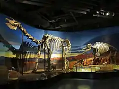 Skeletal mount (left) of Paraceratherium lepdium, which is possibly a synonym of D. turfanense, Turpan Museum