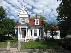 The E. A. Durgin House is a historic house at 113 Summer Street in Stoneham, Massachusetts. The two-story wood-frame Second Empire style house was built c. 1870 for E. A. Durgin, a local shoe dealer, and is one of Stoneham's most elaborately styled 19th century houses. Its main feature is a square tower with a steeply pitched gable roof that stands over the entrance. The gable of the tower is clad in scalloped wood shingles, and includes a small window that is topped by its own gable. The house has a typical mansard roof, although the original slate has been replaced with asphalt shingling, with a cornice that is decorated with dentil molding and studded by paired brackets.[2]