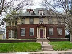 The E.P. Adler House is located set back from Main Street on a low terraced lot, just south of Vander Veer Park. It exhibits a mixture of the Colonial Revival and Prairie School architectural styles.[6] The Colonial Revival features includes its symmetrical five-bay main façade, a hipped roof with dormers, and a main entrance that is framed by sidelights and a transom above. The entrance is also surrounded by a shallow curved pediment with engaged columns. The Prairie style is represented by wide eaves with stylized projecting rafter ends and the combination of brick and stucco surface materials.