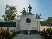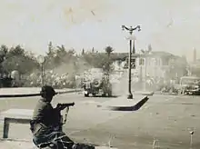 Operation "Forward to Victory" (Greek name) was launched on November 18 and was accompanied by several bomb attacks.[61] In the urban areas, schoolchildren had a prominent role in the EOKA struggle. The Battle of Flags, escalated during the Autumn of 1955 and peaked in January and February 1956– that kept British forces busy away from chasing down EOKA.[62][63] Schoolboys were not only participating in riots and stone-throwing against the police, but some of them were also trained to throw bombs and carry assassinations.[64] Bombs by guerrillas and youngsters were thrown at British personnel houses, police stations and army camps.[65][66] In some cases, EOKA members managed to steal some weaponry.[67] The British were never to succeed completely eliminating EOKA agents from the police force.[49]