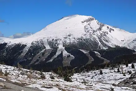 Like other mountains in Banff Park, Eagle Mountain is composed of sedimentary rock laid down from the Precambrian to Jurassic periods.[7] Formed in shallow seas, this sedimentary rock was pushed east and over the top of younger rock during the Laramide orogeny.[8]