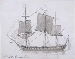 Under the command of James Tennent, Earl Cornwallis sailed from Portsmouth on 18 November 1800, and arrived at Port Jackson on 12 June 1801.[4] She transported 193 male and 95 female convicts, of whom 27 male and eight female convicts died.[9] All had died of dysentery, and many of the survivors were weak and feeble.[10] One officer and 20 men of the New South Wales Corps provided guards.