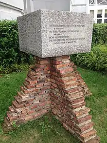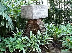 ![]() The foundation stone of the Monument of the Early Founders of Singapore in the grounds of The Fullerton Hotel Singapore. The idea for a monument was proposed in 1969 by Alumni International Singapore, and the foundation stone was laid on the waterfront across the road from Fullerton Building by the first President of Singapore, Yusof Ishak, on 18 January 1970. However, the monument was never built. The stone was moved to the grounds of the National Archives of Singapore in 2000, and then to its present location. | |