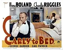 Early to Bed is a 1936 American comedy film directed by Norman Z. McLeod, written by Arthur Kober, Lucien Littlefield, S. J. Perelman and Chandler Sprague, and starring Mary Boland, Charlie Ruggles, George Barbier, Gail Patrick, Robert McWade and Lucien Littlefield. It was released on June 25, 1936, by Paramount Pictures.[1][2]