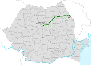 Early plans estimated the first opening as early as 2009.[4] With a total length of around 304 kilometres (189 mi),[5] and an estimated cost of 4.07 billion €, the motorway will begin from the junction with the A3 motorway near Târgu Mureș, and will run through Sovata, Ditrău, Târgu Neamț, Pașcani, Târgu Frumos and Iași.[6] At its eastern end, the motorway will cross the Prut river at Ungheni to reach Moldova's R1 highway, which further heads east towards Chișinău.[1]