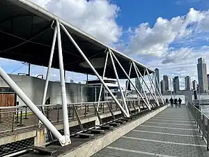 The upgrades to the terminal involved replacing the existing barge near the foot of East 35th Street with a new ferry landing by repurposing a city-owned pier located between East 35th and 36th streets. This pier had been in use until the 1990s and formerly accommodated fuel deliveries for the Kips Bay Generating Station. The inactive pier was repaired and an extension was constructed at its east end, to which two barges were moored. On the south side of the existing pier, a separate pedestrian ramp was constructed between the bulkhead and the pier extension.[61][62] Designed by a team led by Sheila Kennedy and the architecture firm of Kennedy & Violich, the new terminal was completed in 2012 and includes a lenticular fabric roof canopy made of translucent and meshed ETFE that is supported by triangulated columns.[3][63][64][65][66]