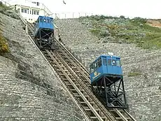 The East Cliff Railway, or East Cliff Lift, is a funicular railway located on the East Cliff of the English seaside resort of Bournemouth. The line serves to link the seaside promenade and beach with the cliff top and the town behind.[1] Following a landslip in April 2016 which damaged the line and associated structures, the railway is out of use indefinitely.