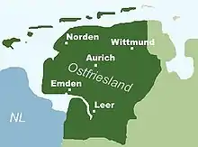 East Frisians (German: Ostfriesen, Saterland Frisian: Aastefräisen) are, in the wider sense, the inhabitants of East Frisia in the northwest of the German state of Lower Saxony. In the narrower sense the East Frisians are the eastern branch of the Frisians, a distinct Germanic ethnic group, and are one of the nationally recognized ethnic minorities in Germany, along with the Danes, Sorbs, Sinti and Romanies.[3] They are closely related to the Saterland Frisians, who come from East Frisia and moved from the coastal region to the interior. The East Frisians are also related to the North Frisians and the Westlauwers Frisians.[4]