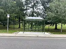 A bus stop for the n27 on Harbor Hill Road in October 2021. The bus shelter pictured was donated by residents Adam and Reneé Haber.
