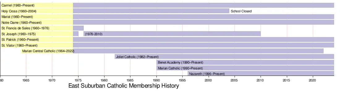 In 1970, Joliet Catholic temporarily left, with four new schools joining: Marist, St. Joseph, St. Patrick, and St. Viator. With the conference now at 14, the conference divided into two divisions. The East Division included the four new schools, Carmel, Notre Dame, and Holy Cross High School. In 1971 St. Francis de Sales High School joined the East Division.