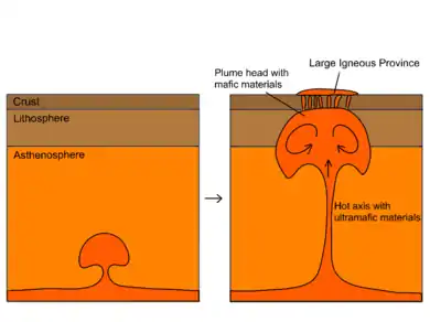 A mantle plume model showing the formation of a Large Igneous Province with ultramafic and basaltic materials. Deep Earth's materials rise, which intrudes the lithosphere and stretches the crust. A large amount of melts erupts on the Earth's surface as a Large Igneous Province.[58]
