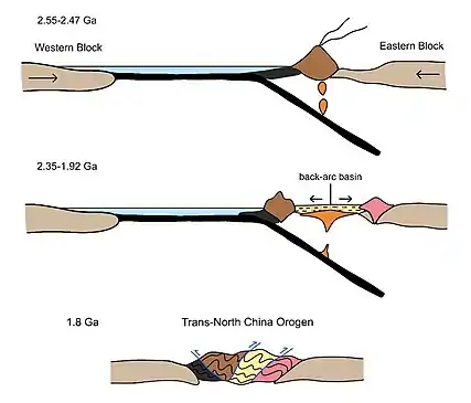 Other than the subduction and collision on the eastern side of the Eastern Block, subduction also happened at the western margin. The subduction lasted from 2.55 to 1.85 billion years ago.[1] It closed the ocean between the Eastern and Western Blocks of the North China Craton and formed the Trans-North China Orogen.[8]