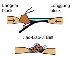 Cross-sections showing the arc-continent collision which formed the Jiao-Liao-Ji Belt.[1]