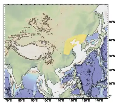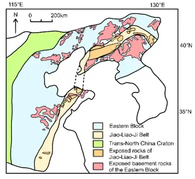 The Eastern Block consists of two sub-blocks, which are linked by the Jiao-Liao-Ji Belt.[1] On the northwest of the Belt, there is the Longgang (Yanliao) Block, while on the southeast, there is the Langrim Block.[1]
