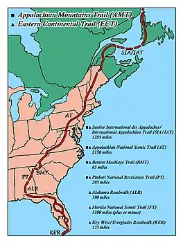 From south to north, the route strings together the Florida Keys Overseas Heritage Trail (a rail trail that is partially complete as of early 2022), the Florida Trail, a road walk through southern Alabama, the Pinhoti National Recreation Trail, and part of the Benton MacKaye Trail, to reach the southern terminus of the Appalachian Trail at Springer Mountain, Georgia. The ECT includes the entire Appalachian Trail to Mount Katahdin, Maine, then continues on the International Appalachian Trail through Maine, New Brunswick, and Quebec. The hiking trail ends at the Gulf of St. Lawrence; the hiker can then travel to Newfoundland by other means and complete the next section of the ECT across that island. After another water gap, the ECT reaches its symbolic end at Belle Isle off the northern end of Newfoundland's Great Northern Peninsula.[3][4]
