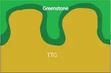 TTGs are an aggregation of certain rocks (tonalite-trondhjemite-granodiorite), that form when hydrous, mafic crust is melted at high pressure. These rocks are critical to the formation of Archean greenstone complexes due to the low density, intrusive nature of the rocks. TTGs are found in other Archean greenstone belts such as Isua and Barberton. The processes that form TTGs are debated. Some authors attribute TTG formation to subduction activity,[8] while others attribute the origin of these melts to the direct melting of the lithosphere by mantle plumes.[9] The debate of the origin of the TTGs is a key topic in the debate of when plate tectonics began.[9]