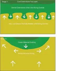 Partial convective overturn is a mechanism by which the geology and structure of the Pilbara Craton can be explained. This mechanism involves cold, dense material sinking into hot, less dense material as it rises in dome/pillar-like formations. This results in steeply dipping anticline–syncline complex, in which the greenstone at the bottom of the syncline experiences the most deformation. As seen in the figure, this process can be described in a simplified version, through 2 stages. In stage 1, heat being radiated from the partially melted granite rising is insulated by the cold greenstone cover, and as a result, the greenstone at the bottom of the formation begins to "drip" down, making room for the granitic to rise further. In stage 2, the small, sporadic greenstone drips and granitic pillars have consolidated into fewer, larger domes and keels as they continue to rise.[10] The end result is a structural geology similar to what we see in Pilbara. This process is also known as vertical tectonics.[15]