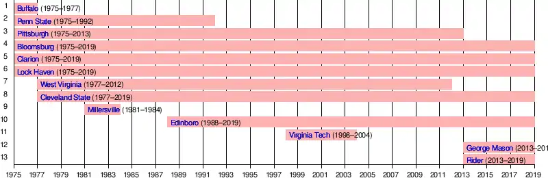 The league's inaugural season was in 1976 (during the 1975–76 academic year) and had a charter group led by Penn State, Pittsburgh, Buffalo and three Pennsylvania State Athletic Conference (PSAC) schools in Bloomsburg, Clarion and Lock Haven. After 1977, Buffalo left the league, but West Virginia and Cleveland State were added, growing the league to seven teams. In 1988–89, the PSAC's Edinboro joined to form an eight-team league.