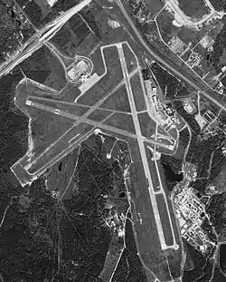 The first control tower was erected at the Airport in 1952 and a commercial passenger terminal was constructed in 1957. Work began on an extension of Runway 16-34 (now 17–35) to its present 7,000-foot (2,100 m) length in 1984. At the same time the parallel taxiway to Runway 16-34 was extended.